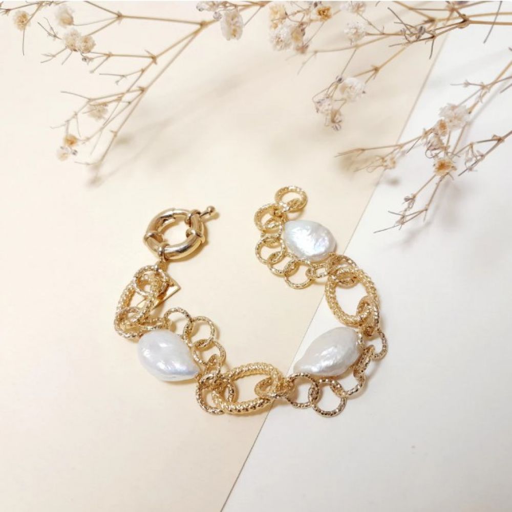 Bracelet Doré Chaines Anneaux Entrelacés Perles de Cultures