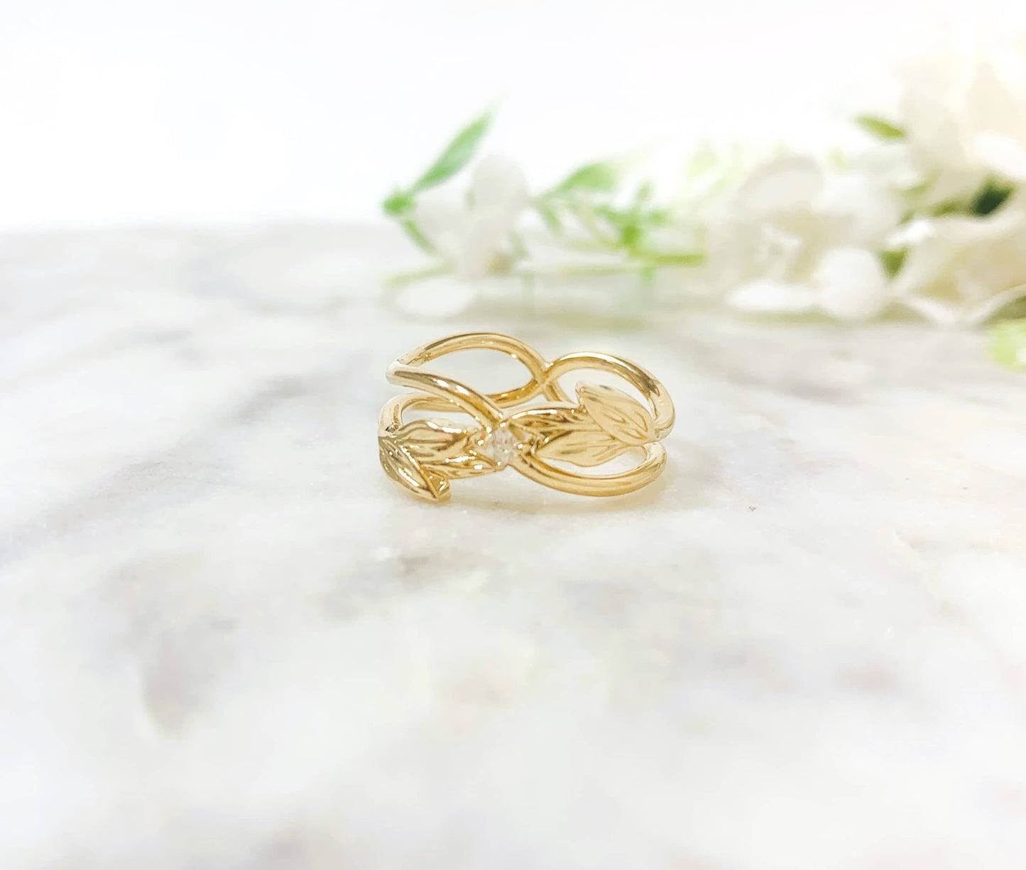 Bague Couronne en laiton plaqué or 3 microns composé d'un zircon blanc posé sur une feuille