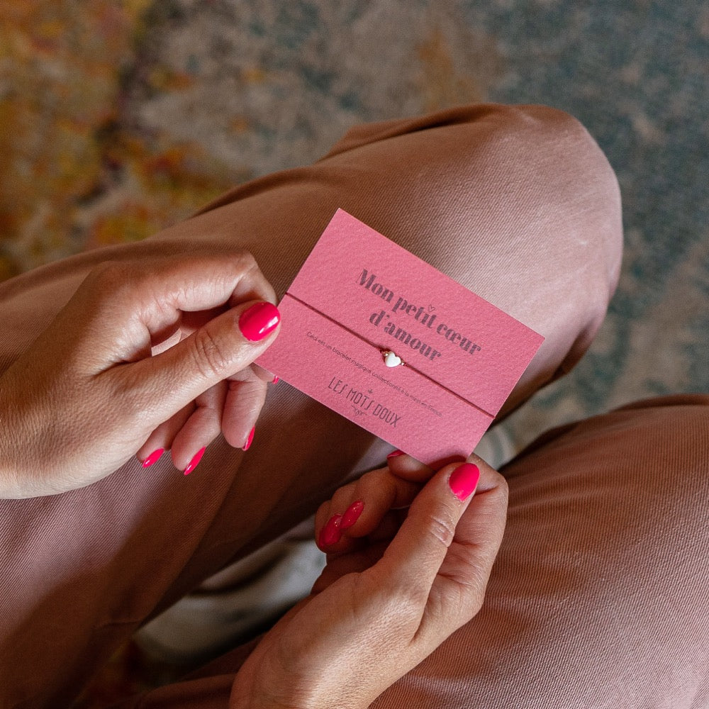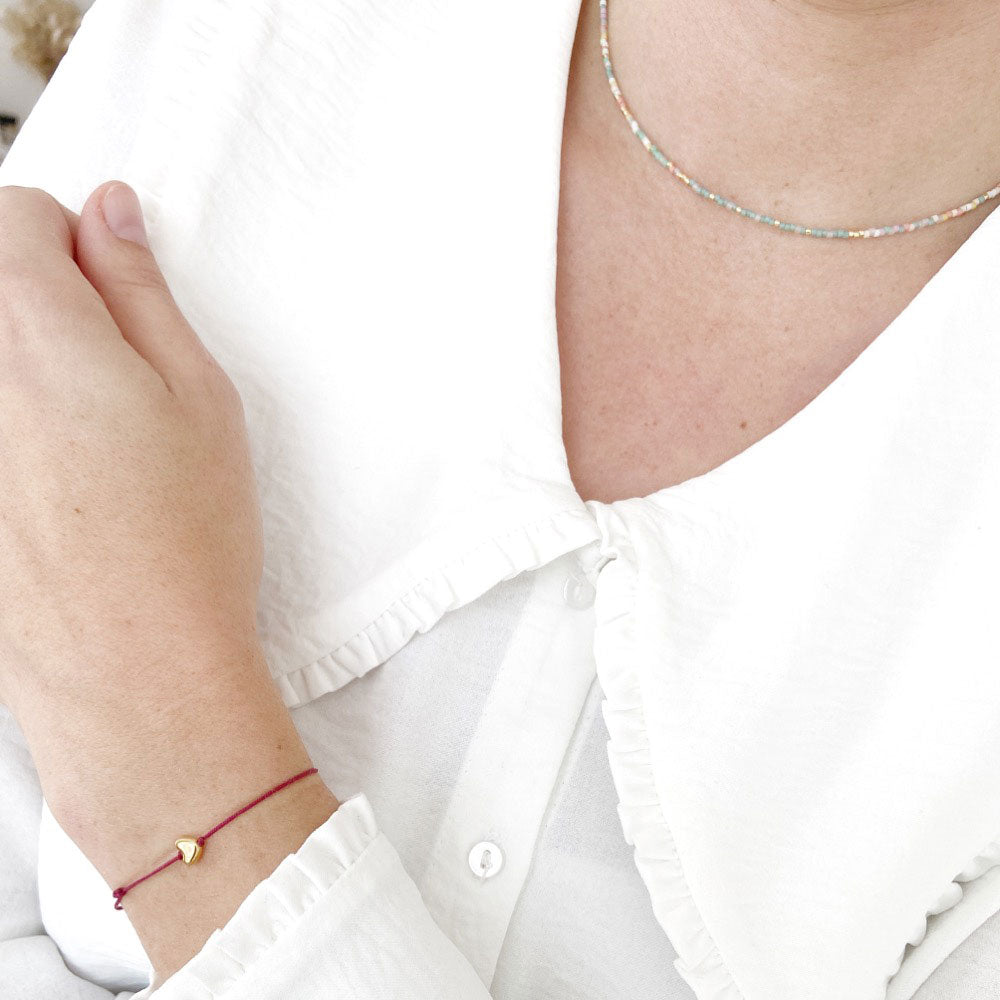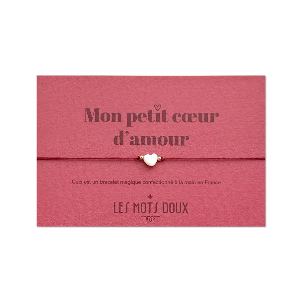 Bracelet Cœur sur cordon ajustable en acrylique composé d'un petit cœur en Nacre et de perles en plaqué or 3 microns
