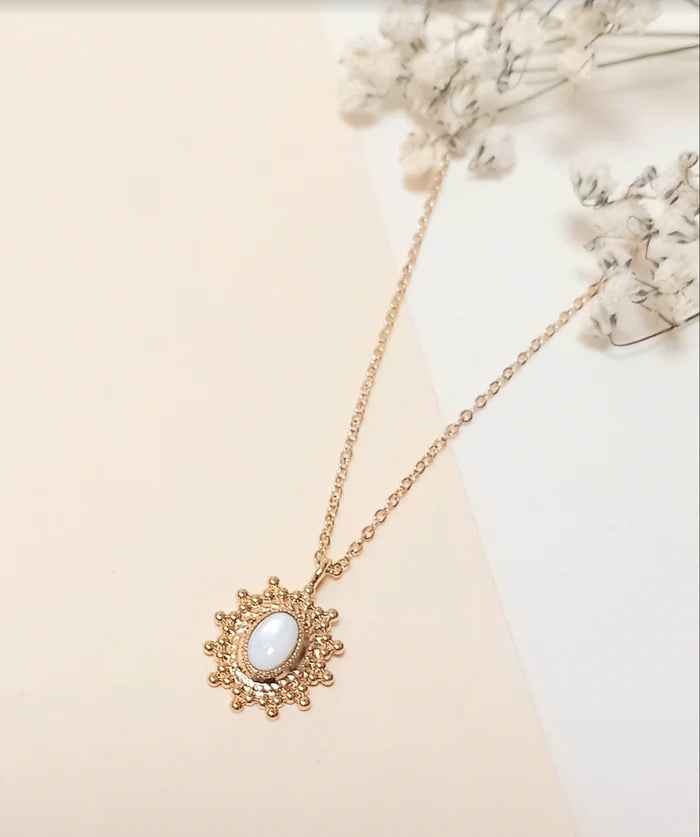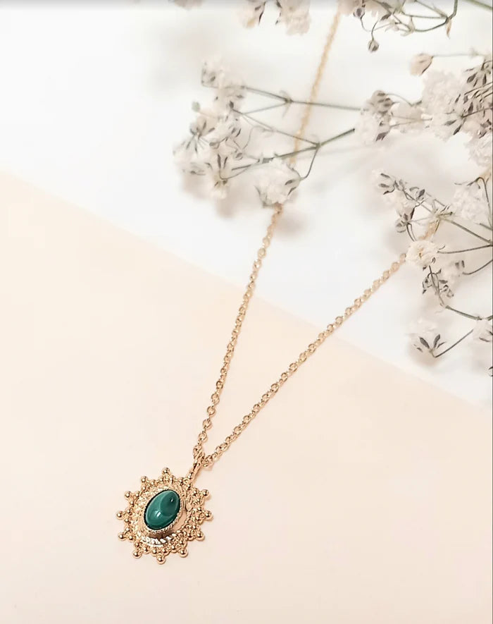 Collier Hélios en laiton doré à l'or fin 24 carats composé d'une pierre fine Nacre ou Malachite sertie entourée d'un cadre solaire