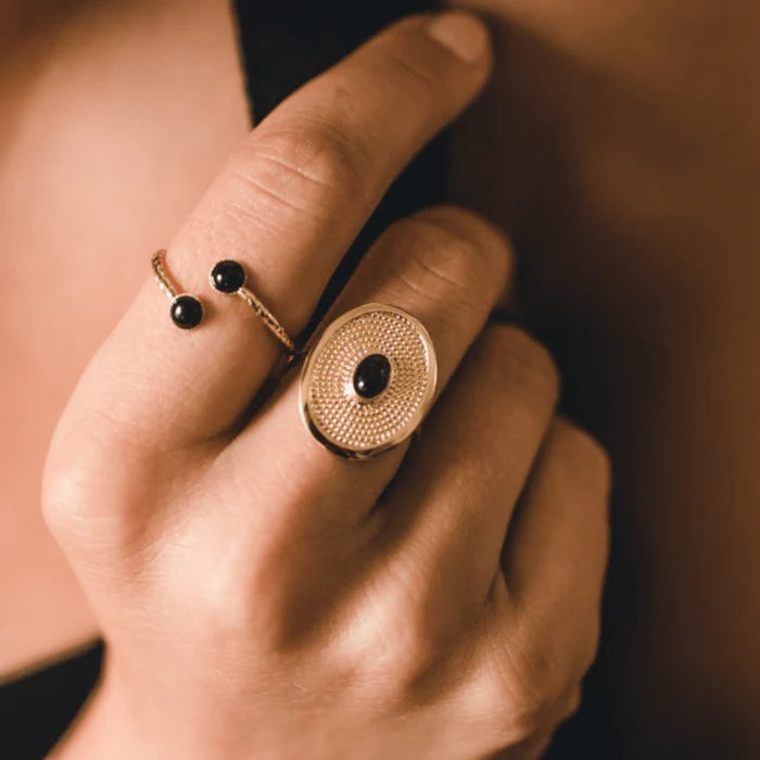 Bague Ajustable 1930 en laiton doré à l'or fin 24 carats sertie d'une Nacre blanche centrale